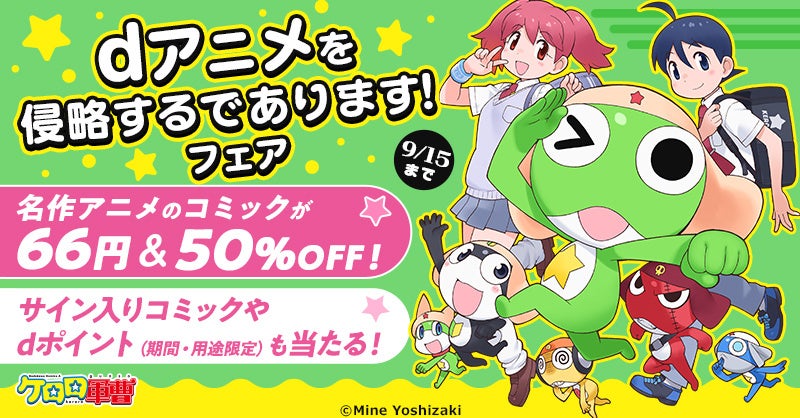 5,700作品以上のアニメが見放題(※)の「dアニメストア」( https://animestore.docomo.ne.jp/ )では、アニメ放送20周年を機に新プロジェクトが発表された「ケロロ軍曹」をはじめ、長く愛され続ける名作アニメのコミックが大集合!の「dアニメを侵略するであります!」フェアを開催中です。期間限定価格でコミックを購入できる他、「ケロロ軍曹」のお気に入りエピソードをXで投稿することで、作者・吉崎観音先生のサイン本をプレゼント!さらに、dポイント(期間・用途限定)が当たるキャンペーンも!