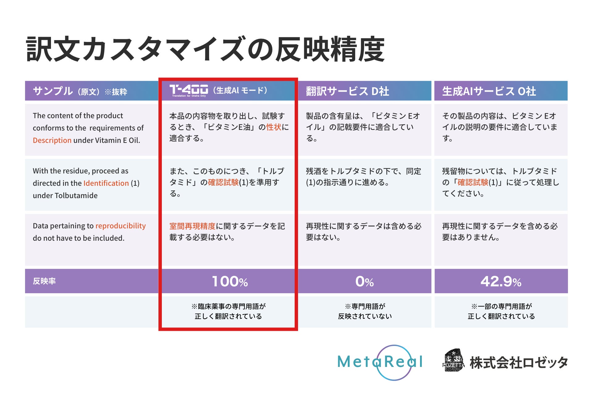 株式会社メタリアル(本社:東京都千代田区、代表取締役:五石 順一)グループでAI翻訳サービスを開発・提供する株式会社ロゼッタ(代表取締役:渡邊 麻呂)は、国内市場No.1*となる高精度AI自動翻訳「T-4OO」の精度評価試験(2025年2月実施)において、参考文献からの専門用語の反映精度がほぼ100%を達成したことを確認しました。