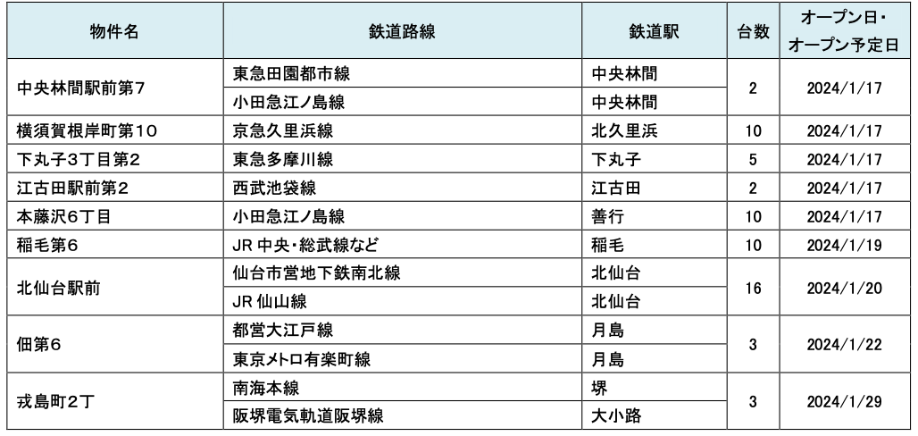 駐車場およびカーシェアステーションのオープン予定については毎月第5営業日にお知らせいたします。
