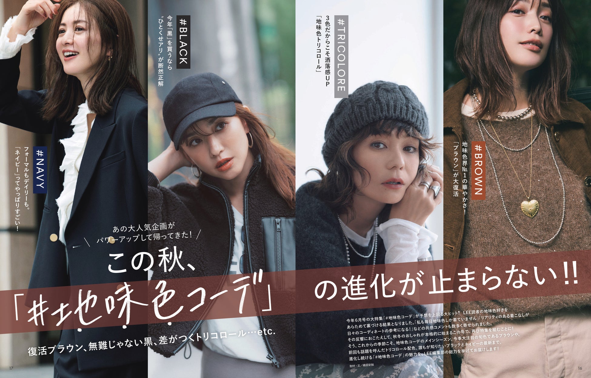 また、ファッション大特集は『この秋、「#地味色コーデ」の進化が止まらない!』。「地味色」とは、黒やネイビー、グレー、ブラウン等のベーシックカラーのこと。「LEE」は、一見“地味”“無難”とされがちな「地味色」だけを使いこなし、取り入れやすさとおしゃれの高揚感を両立する装いを、2023年5月号以来、半年に一度、様々な角度から提案し続けています。本号では、アイテムや素材に加えて装いのシーンも多様化する秋のコーディネートに、心地よく楽しく「地味色」を取り入れる方法を紹介します。