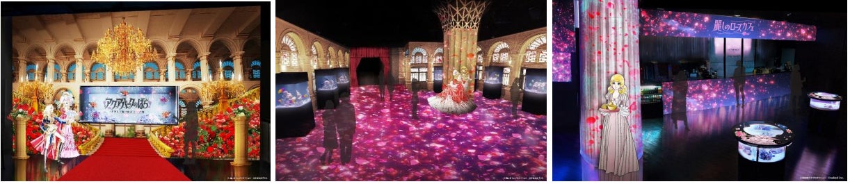 1エリアで22台のプロジェクターを使用した、ダイナミックな映像演出が特長の展示エリア。四方を囲む約3.6mの壁には作品の舞台を彷彿とさせる煌びやかな“宮殿”の内装を、床面には可憐な花びらを絨毯のように描きました。