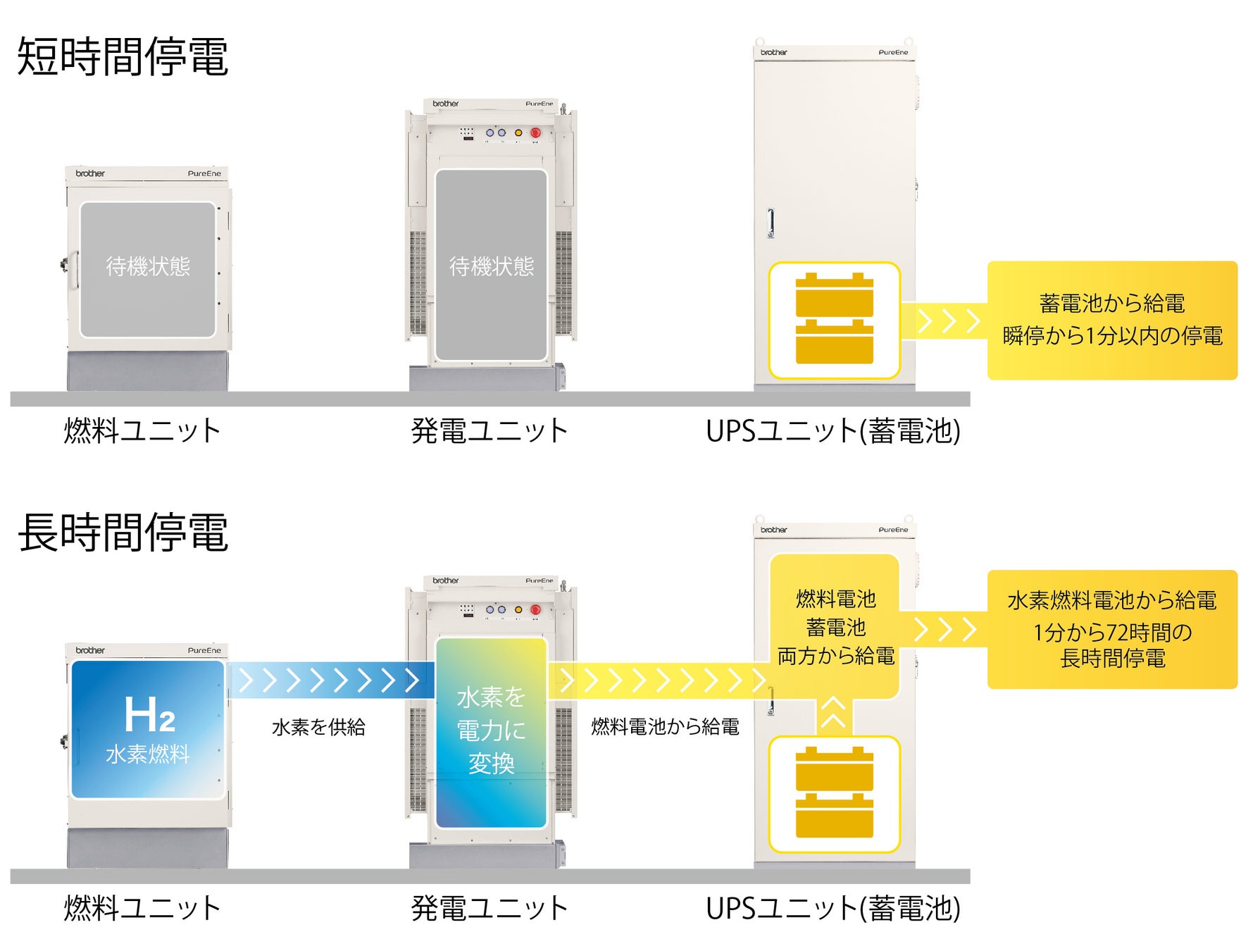 AC-UPSシリーズは、ブラザーの水素利活用を推進する取り組みを象徴するブランド「PureEne*1(ピュアエネ)」初の製品で、水素をエネルギー源とした、燃料ユニット、発電ユニット、UPS(Uninterruptible Power Supply=無停電電源装置)から構成される、ハイブリッドUPSだ。長時間の電源のバックアップが可能で、鉄道、空港、道路など、都市の重要な交通インフラで利用される電気機器を、瞬間的な停電から長時間にわたる停電まで、さまざまな停電から守ることができるという。また、高耐久な製品設計に加え、燃料となる水素を劣化しない水素吸蔵合金に充填して燃料供給することで、15年の期待寿命を実現している。