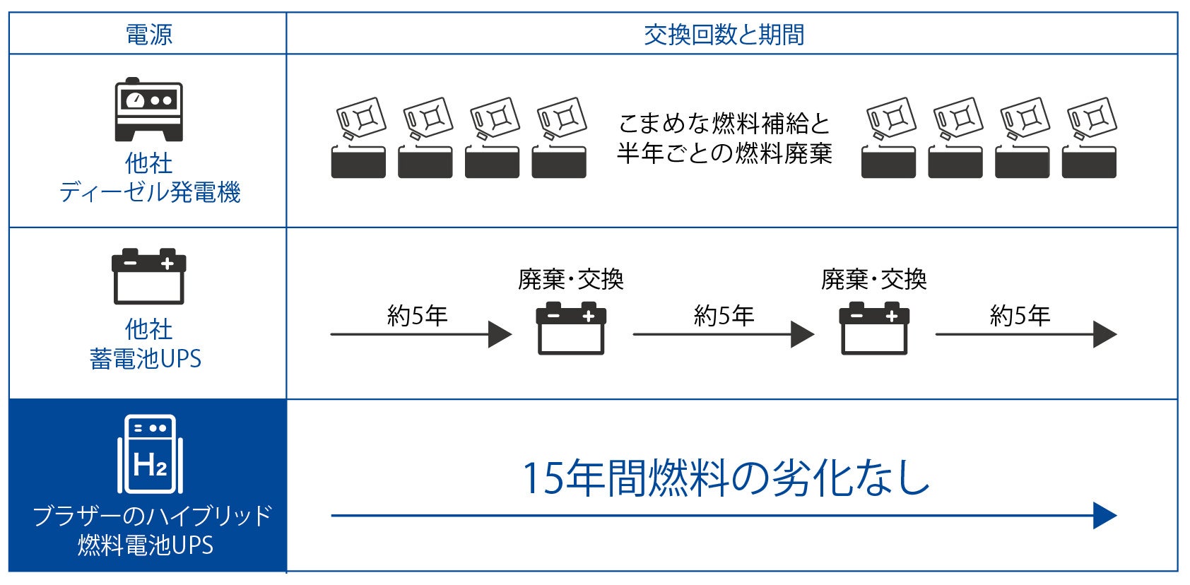 バックアップ電源が設置されるのは、屋外の厳しい環境が多いため、塩害対策試験や寒冷地試験など、厳しい信頼性試験をクリアしている。ブラザーのハイブリットUPSは、どのような設置環境でも期待寿命である15年間は燃料の劣化がないため、ライフサイクルを通じた機器の入れ替え回数を少なくできるメリットもある。