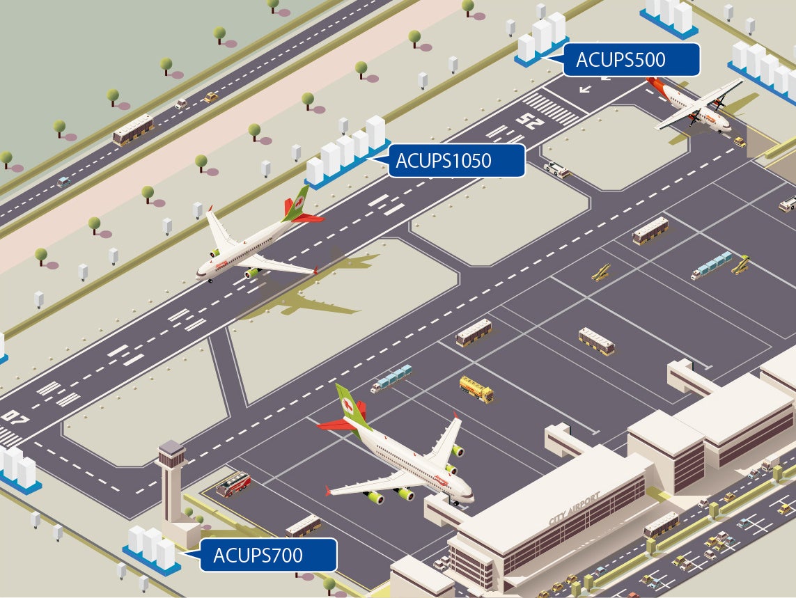AC-UPSシリーズは、鉄道や道路、空港をはじめとする交通インフラで使用する機器の非常時の電力供給などに適している。