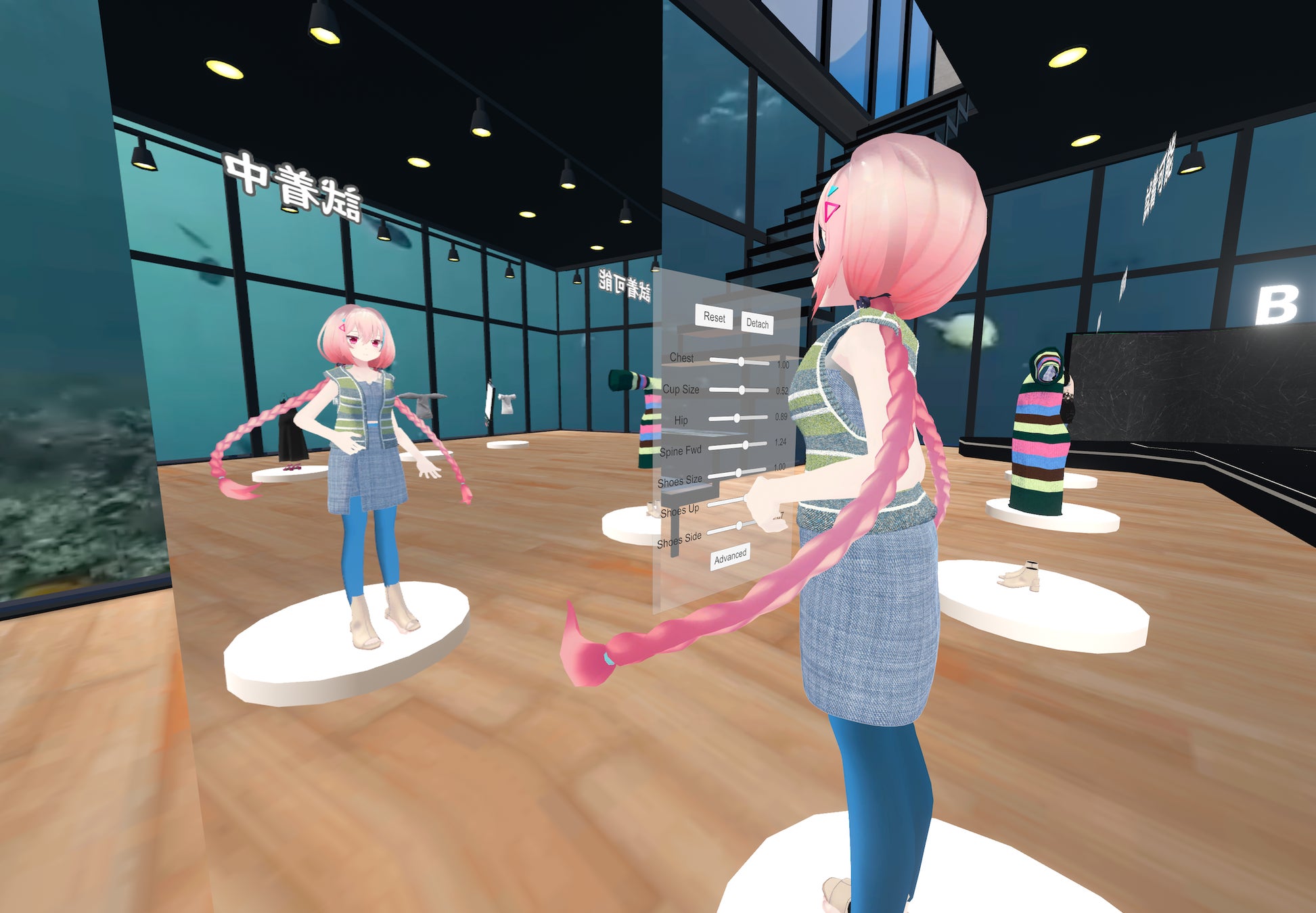 今回新しく実装した試着機能では、鏡の横に表示される調整パネルを操作することで胸・腰・背骨・足など体の部位ごとに衣装のサイズや角度を調整でき、ユーザーがご自身のアバターに合わせることはもちろん、ショップスタッフがお客様の試着をお手伝いすることも可能になります。バーチャルマーケットが開催されるソーシャルVRプラットフォーム「VRChat」などの環境においてユーザーが使うアバターは形もサイズも千差万別で、3D衣装の自動試着は特に難しいものですが、アバターそれぞれの体格に合わせて衣装の3Dモデルを調整する機能を搭載したことで、ユーザーが好きなアバターで好きな服を着る体験を充実させます。