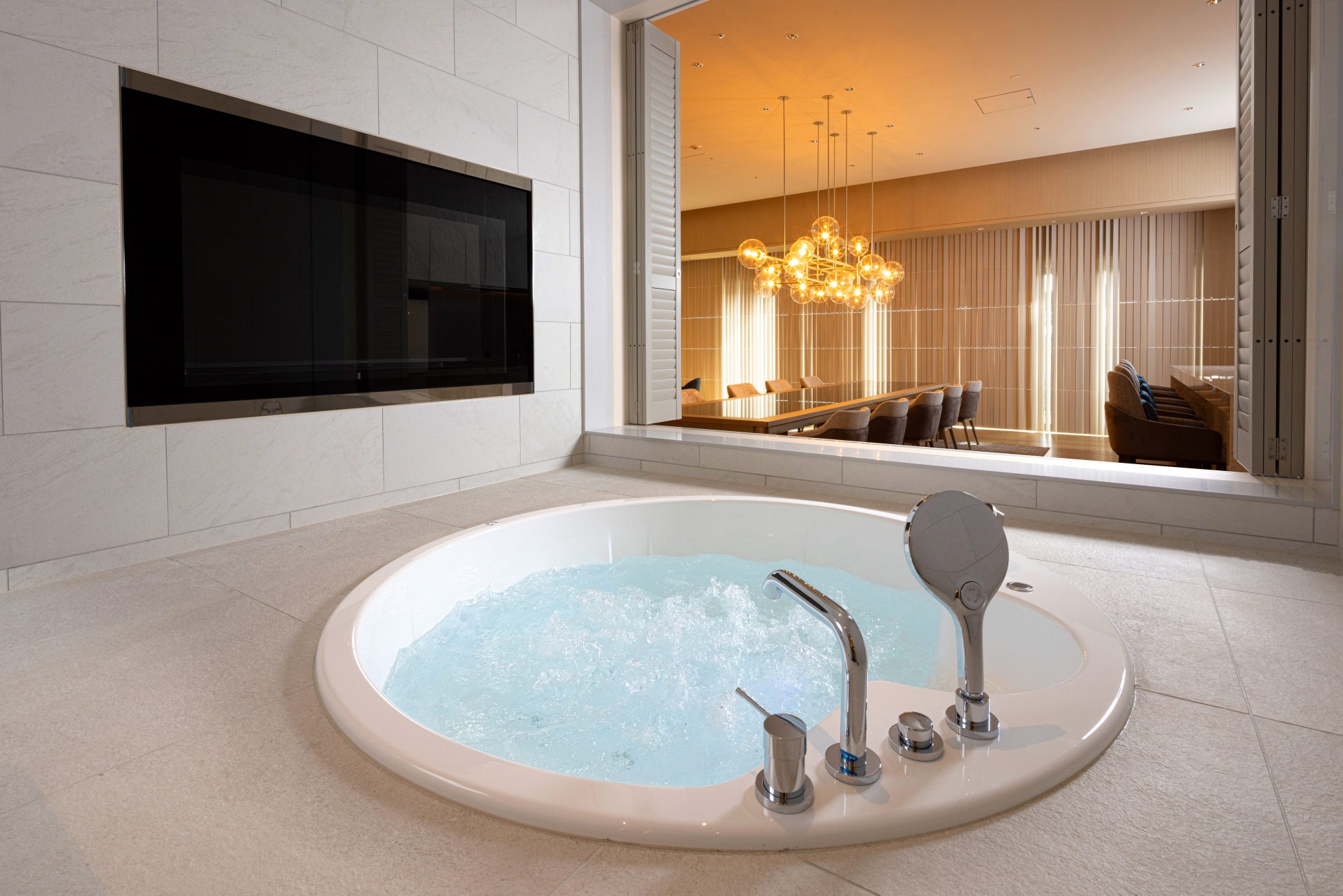 窓の外に広がるサッカースタジアムの壮大な景色を一望しながらご入浴いただける室内ジェットバスを、さらにバスタブの目の前には50型テレビも設置しています。開放感と静寂に満ちたこのひとときが、日常の喧騒を忘れさせる格別な安らぎを提供します。
