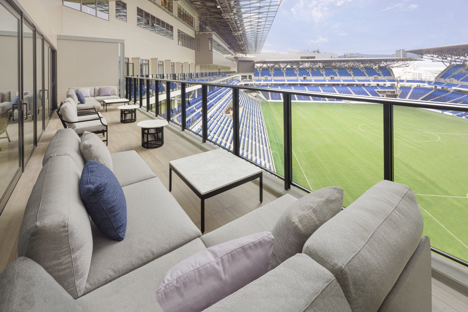 サッカースタジアムのダイナミックな眺望を望むバルコニーをご用意いたしました。 長崎スタジアムシティならではの格別な景色を、心安らぐ上質な空間からお楽しみいただけます。