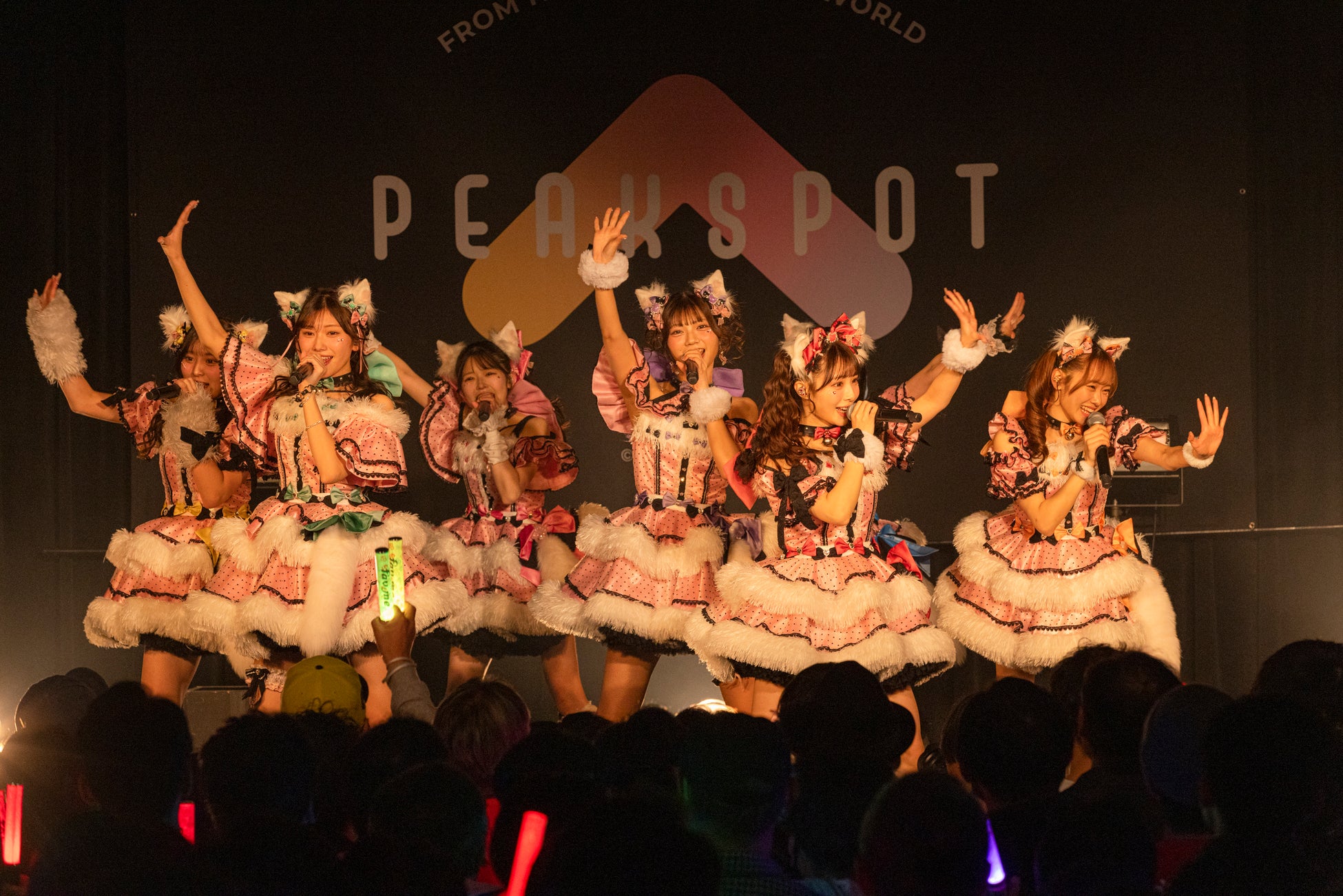 Toi Toi Toi、log youの熱いステージが終わり、トリを努めたのはPEAK SPOT 第一のグループであるfav me。「ストレイト・ストライド」からライブをスタートし、後輩グループたちから引き継いだ会場の熱気をさらに上げる。勢いそのままに「ケーキを食べればいいんじゃない!?」、初お披露目となる新曲「キュンってして!」、そして12月24日(水)にリリースされる1stシングルCD表題曲「すきなんかじゃ...にゃい!」「蒼のラブレター」を立て続けに披露。ラストは「あの時、キミが好きだった」をドラマチックに歌い上げ、fav meの持つ変幻自在の魅力を見せた。