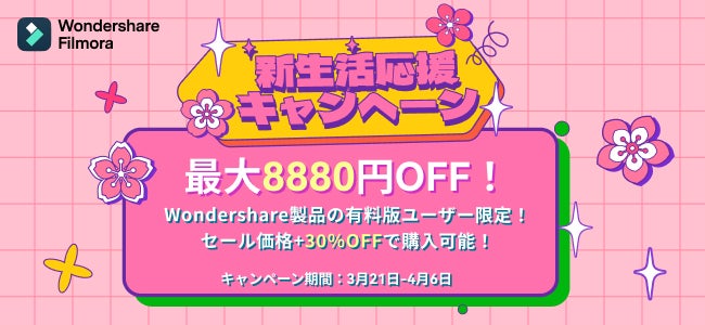 世界150か国以上で利用されるソフトウェアを手掛ける、株式会社ワンダーシェアーソフトウェア(東京都千代田区、代表:呉太兵)は、手軽にクオリティの高い動画が作れるPC向け動画編集ソフトWondershare Filmora(ワンダーシェアーフィモーラ)シリーズが、2022年3月21日(月)~2022年4月6日(水)まで、最大8,880円OFFになる新生活応援キャンペーンを実施いたします。またワンダーシェアー製品有料版ユーザーの方は対象製品をキャンペーン価格からさらに30%OFFでお買い求めいただけます。この機会にワンダーシェアー製品をぜひお試しください。