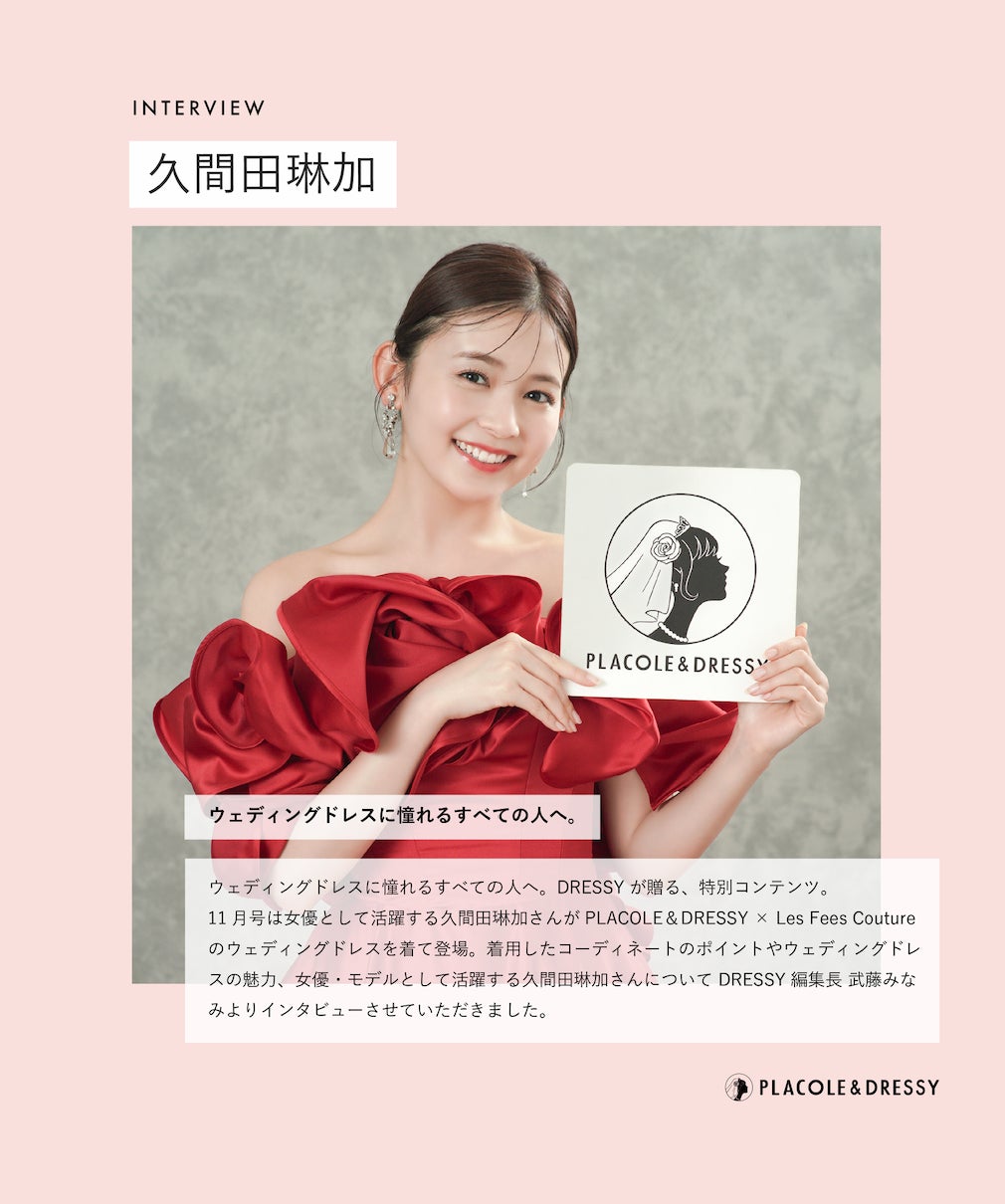 11月号は女優として活躍する久間田琳加さんがPLACOLE&DRESSY × Les Fees Couture のウェディングドレスを着て登場。着用したコーディネートのポイントやウェディングドレスの魅力、女優として活躍する久間田琳加さんについて DRESSY編集長 武藤みなみよりインタビューさせていただきました。