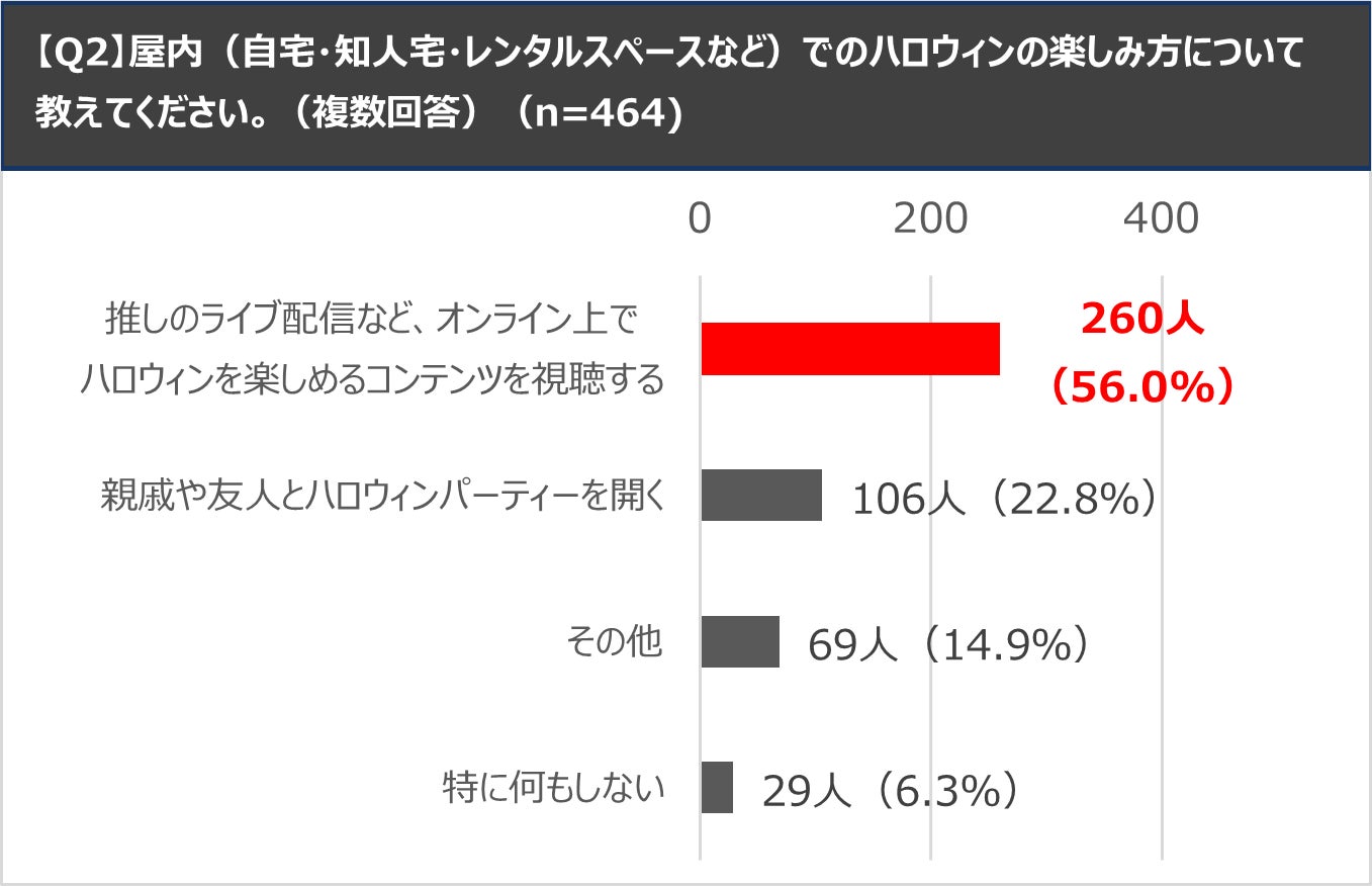 ・「屋内でハロウィンを楽しむ」と回答した方の半数以上(56.0%)が推しのライブ配信など、オンライン上でハロウィンを楽しめるコンテンツを視聴すると回答!