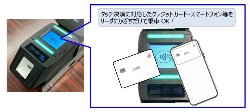 本サービスでは、お客さまがお持ちのタッチ決済対応のカードや同カードが設定されたスマートフォン等を専用リーダにタッチすることでご乗車いただけるようになります。これにより、山陰地方を訪れる観光客や地元のお客様が、券売機に並んで切符を購入することなく、スムーズに空港連絡バスをご利用いただけるようになります。
