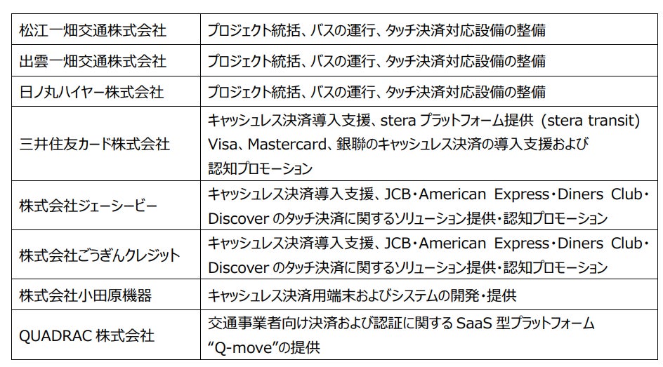 松江一畑交通株式会社(本社:島根県松江市、代表取締役社長:立𦚰 等)、出雲一畑交通株式会社(本社:島根県出雲市、代表取締役社長:立𦚰 等)、日ノ丸ハイヤー株式会社(本社:鳥取県鳥取市、代表取締役:岡 周一)、三井住友カード株式会社(本社:東京都江東区、代表取締役社長:大西 幸彦)、株式会社ジェーシービー(本社:東京都港区、代表取締役兼執行役員社長:二重 孝好)、株式会社ごうぎんクレジット(本社:島根県松江市、代表取締役社長:矢野 泰治)、株式会社小田原機器(本社:神奈川県小田原市、代表取締役:丸山 明義)、QUADRAC株式会社(本社:東京都港区、代表取締役社長:高田 昌幸)は2025年3月1日(土)より、「出雲縁結び空港連絡バス」ならびに「米子鬼太郎空港連絡バス(JR松江駅方面)」において、三井住友カードが提供する公共交通機関向けソリューション「stera transit」を活用した、タッチ決済対応のカード(クレジット、デビット、プリペイド)や、同カードが設定されたスマートフォン等による乗車サービスを開始することを発表します。