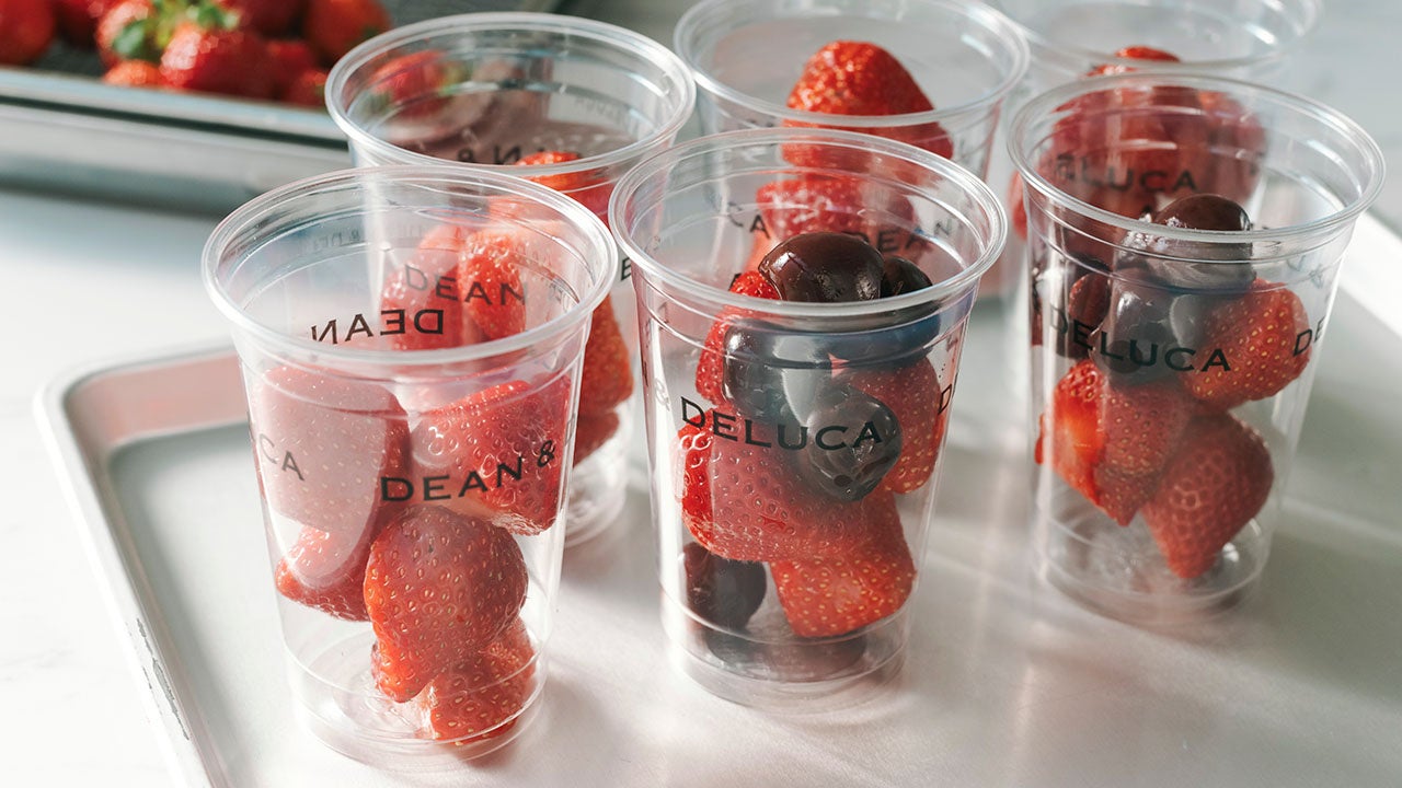 ストロベリー&チェリーに使用するダークチェリーは、シロップ漬けにして味わいを凝縮。ミキサーに