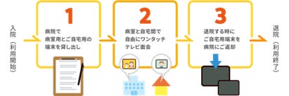 当サービスは、オンライン面会に必要な機器や通信環境を、病院から患者さま・ご家族へ全て設定したうえで貸し出し「扉を開くだけ」の簡単な操作で、離れて暮らす患者さまとご家族がお互いの様子を確認できるため、安心して入院生活を送ることができます。