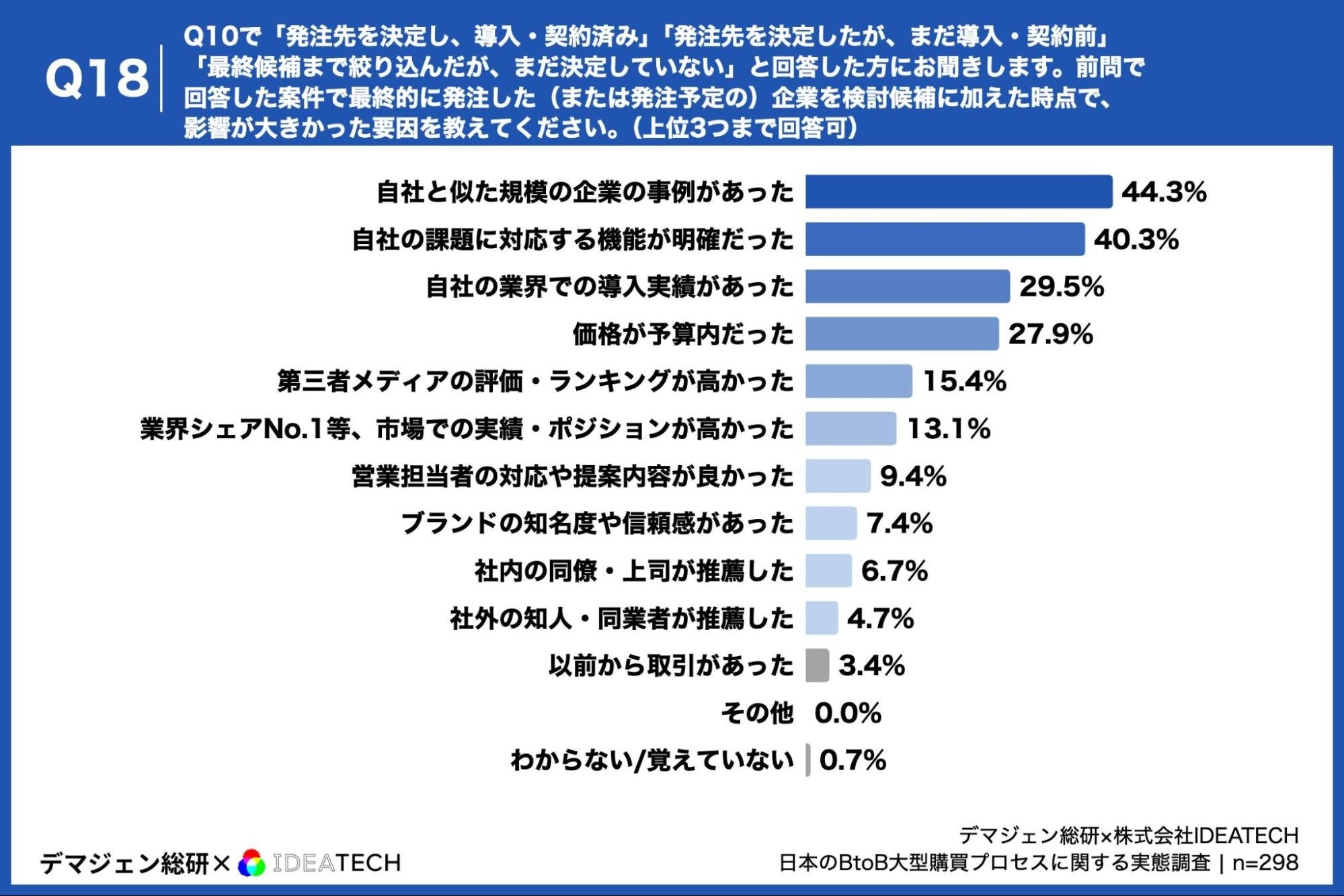 「Q18. Q10で「発注先を決定し、導入・契約済み」「発注先を決定したが、まだ導入・契約前」「最終候補まで絞り込んだが、まだ決定していない」と回答した方にお聞きします。前問で回答した案件で最終的に発注した(または発注予定の)企業を、検討候補に加えた時点で、影響が大きかった要因を教えてください。(上位3つまで回答可)」(n=298)と質問したところ、「自社と似た規模の企業の事例があった」が44.3%、「自社の課題に対応する機能が明確だった」が40.3%、「自社の業界での導入実績があった」が29.5%という回答となりました。