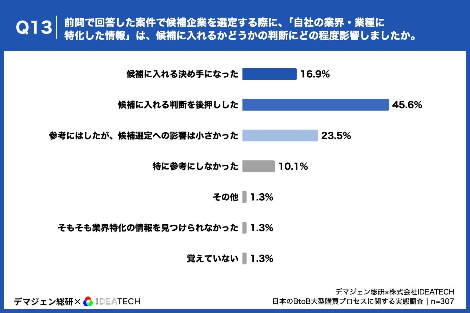 「Q13. 前問で回答した案件で候補企業を選定する際に、「自社の業界・業種に特化した情報」(業界特化の導入事例、同業種向け機能紹介、業界固有の課題解決事例など)は、候補に入れるかどうかの判断にどの程度影響しましたか。」(n=307)と質問したところ、「候補に入れる決め手になった」が16.9%、「候補に入れる判断を後押しした」が45.6%という回答となりました。