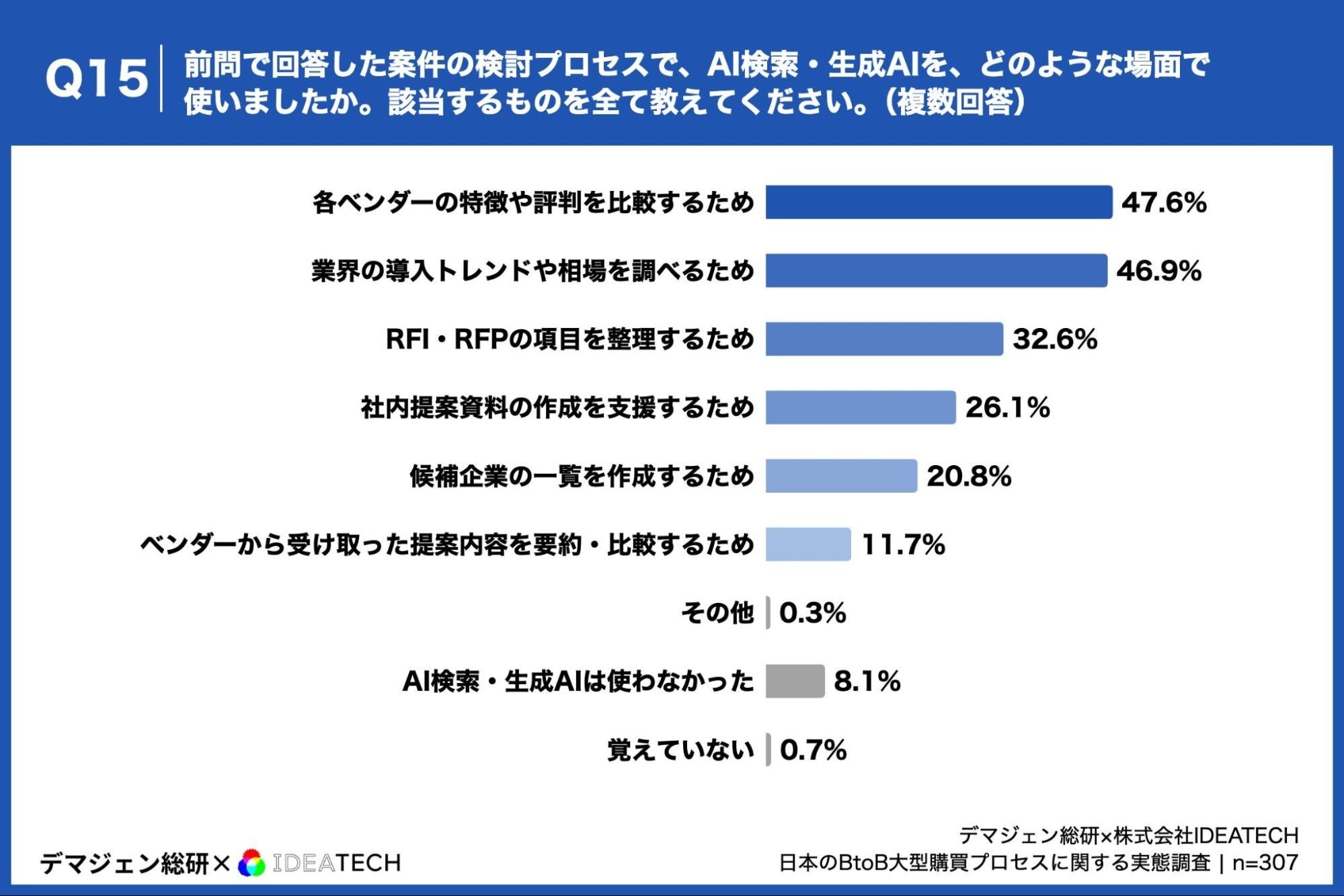 「Q15. 前問で回答した案件の検討プロセスで、AI検索・生成AI(ChatGPT、Perplexity、Copilotなど)を、どのような場面で使いましたか。該当するものを全て教えてください。(複数回答)」(n=307)と質問したところ、「各ベンダーの特徴や評判を比較するため」が47.6%、「業界の導入トレンドや相場を調べるため」が46.9%、「RFI・RFPの項目を整理するため」が32.6%という回答となりました。