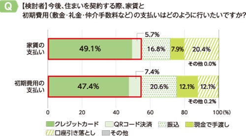 今後住まいを契約する際に希望する家賃・初期費用の支払い方法について聞くと、家賃・初期費用ともに、検討者の半数以上がクレジットカード・QRコード決済での支払いを希望しました。