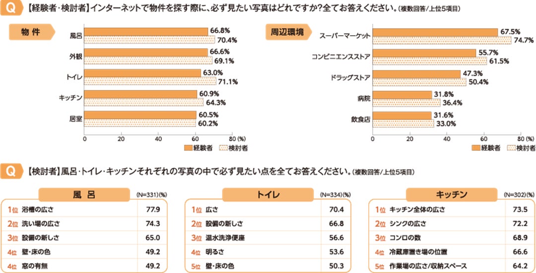 インターネットで物件を探した際に、必ず掲載してほしい写真は、経験者は「風呂」・検討者は「トイレ」がトップでした。水回りの写真では、広さを重視している人が多いようです。一方、周辺環境の写真は、経験者・検討者ともに「スーパーマーケット」がトップでした。