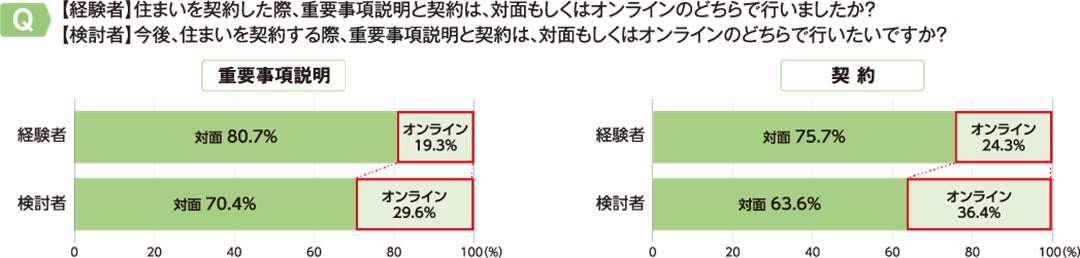 オンラインでの重要事項説明・契約の利用経験・意向を聞いてみると、オンラインで重要事項説明を受けたい検討者は29.6%で、契約は36.4%でした。