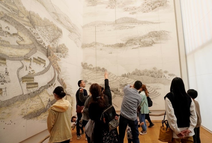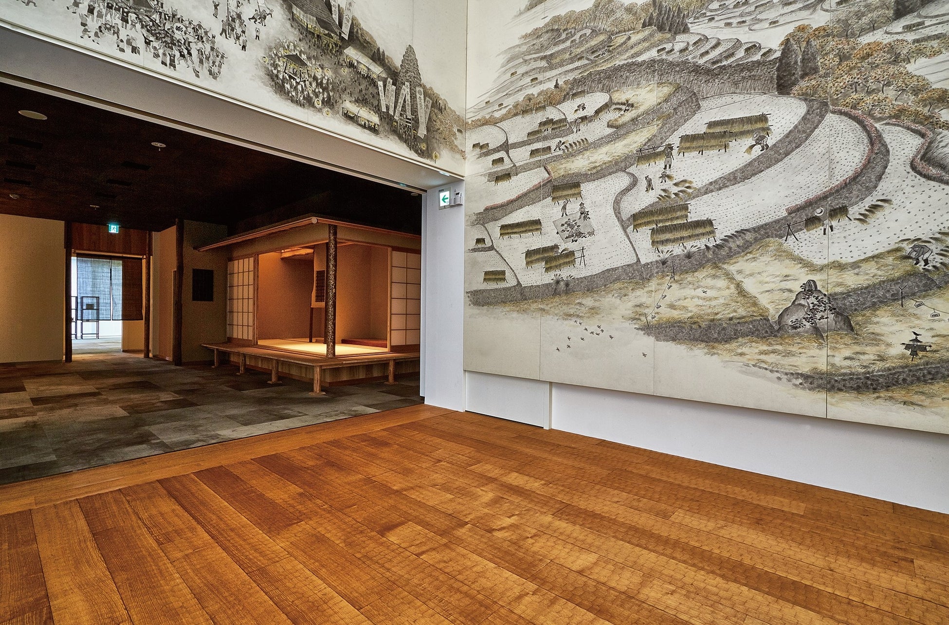 日本の美しい四季の中にある棚田を、細川護熙氏が墨絵で描いた作品「棚田の四季」。2m×1mの大きさの和紙60枚によって構成され、見る面や高さによって風景と四季が変わる表情豊かな作品です。米文化継承活動のシンボルとなる、天高8mの壮大な壁画です。