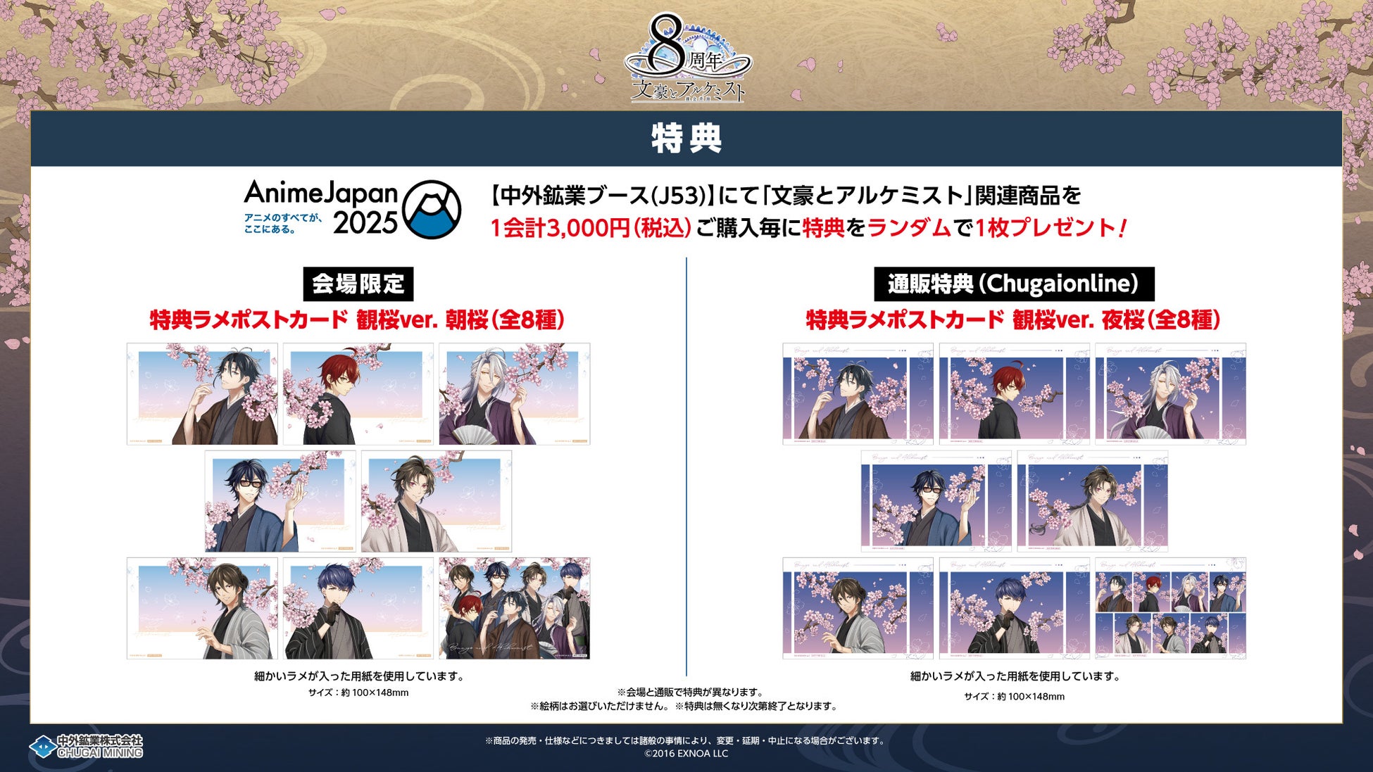 中外鉱業コンテンツ部ECサイトにて『文豪とアルケミスト』AnimeJapan 2025関連商品を1会計3,000円(税込)ご購入毎に、特典ラメポストカード 観桜ver. 夜桜(全8種)をランダムで1枚お渡しいたします!