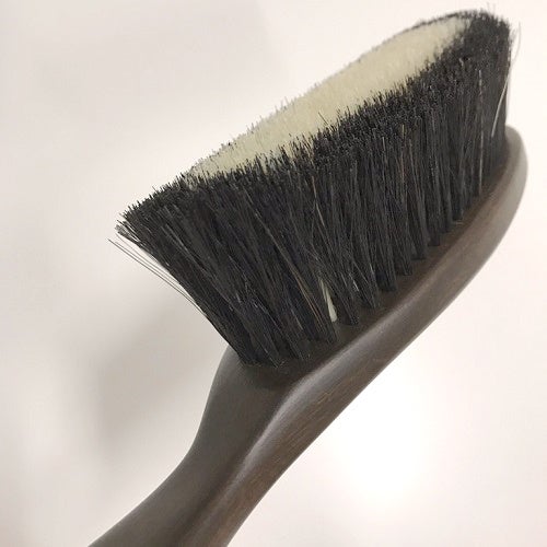 職人がブラシ面を丸みのある形にカットした、生地に優しく沿う洋服ブラシ 。しなやかな馬毛とコシのある豚毛を組み合わせたっぷりとした毛量で幅広い生地の花粉を効率的に払い落とせます 。襟から裾へ織り目に沿ってブラッシングすることで衣類を清潔に保ち艶を与えます 。