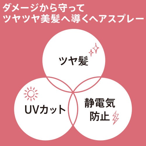 プレーするだけでなめらかな質感のツヤ髪へ導くヘアスプレー。お出かけ前にスプレーすることで静電気を抑制し、髪への花粉付着を低減します 。静電気や紫外線などのダメージからオールシーズン髪を守り、潤いを与えながらもベタつかず、サラサラな仕上がりを実現します 。持ち運びに便利なコンパクトサイズで、SPF50+/PA++++、UV耐水性★★の高い保護機能 。