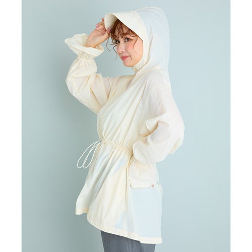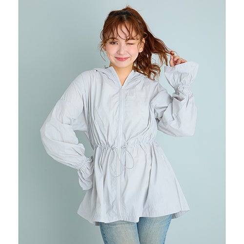 強度が高く、花粉が付きにくい「ナイロンリップストップ」素材を採用したパーカ 。UVカット率99%以上で、春先の強い日差しからも肌を守ります 。ヒップまで隠れる安心の着丈で、サッと羽織れるライトアウターとして活躍します 。ウエストのドロスト紐を絞れば、女性らしいシルエットへの調整が可能。袖口のフリルは手の甲を自然にカバーし、手元を可愛く見せながらUV対策も叶えます 。