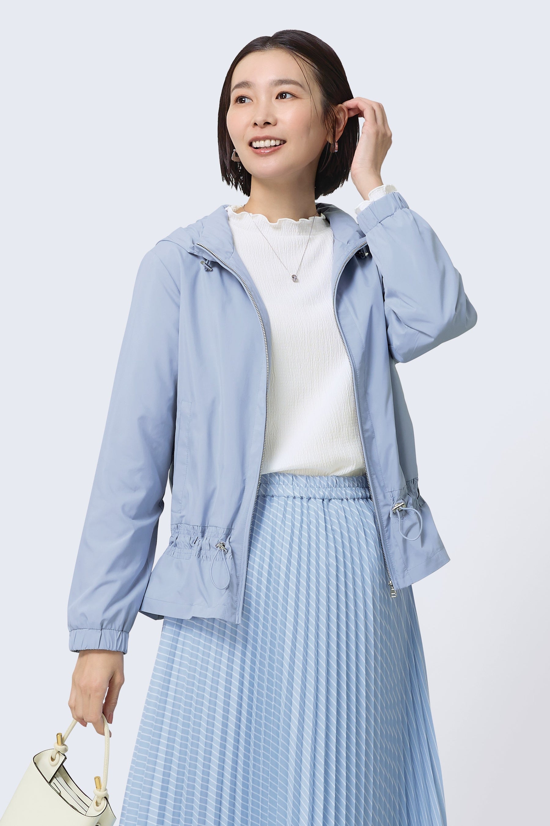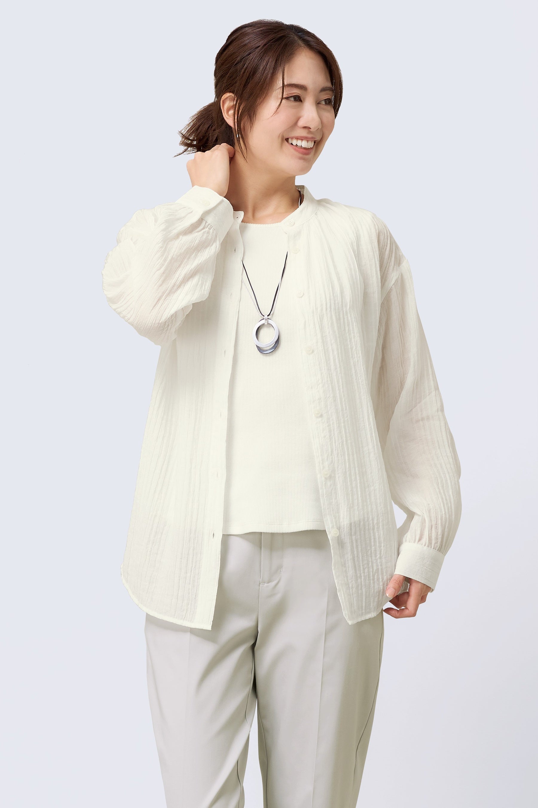 凹凸のある表面感が涼し気で、しわになりにくい素材のブラウス。ライトなシアー感が上品な印象になります。襟ぐりと袖口にギャザーが入った硬すぎないシャツデザインで、適度な張り感が高見えのポイント。羽織りとしても、ボタンを留めてブラウスとしても着られる便利アイテムです。