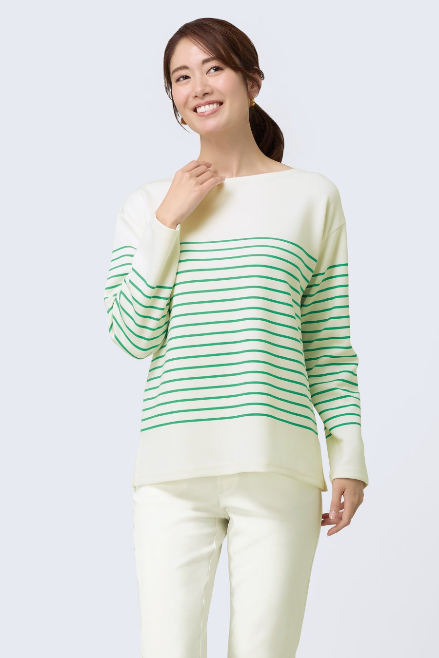体のラインを拾いすぎない、程よいゆとり感で、クリーンなホワイトに春らしいカラーのボーダーが映えるデザインです。毛玉になりにくいアンチピリング加工がされており、綺麗な表面感が続きます。
