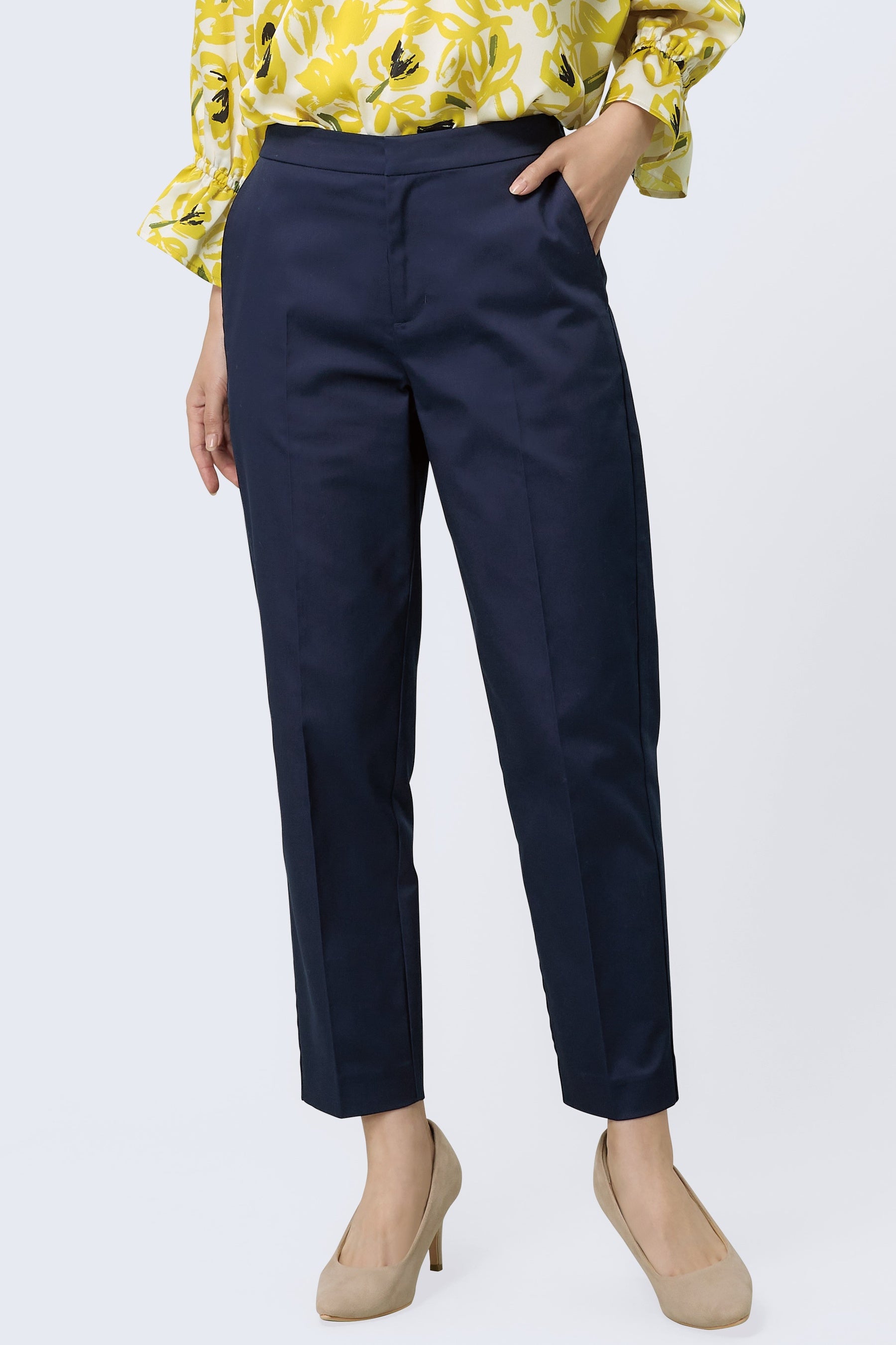 綿混のやわらかな触感と程よいつや感のある素材のテーパードパンツ。センタープレスが利いてきちんと見えしながらも、ウエストがゴムでストレッチも利いているため、はきやすさと綺麗さが両立されています。