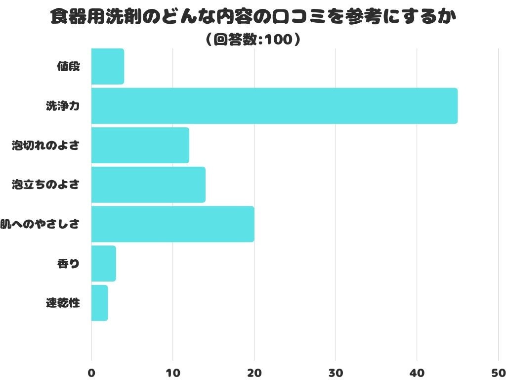 食器用洗剤のどんな内容の口コミを参考にするかをアンケートにて調査したところ、1位は「洗浄力」でした。
