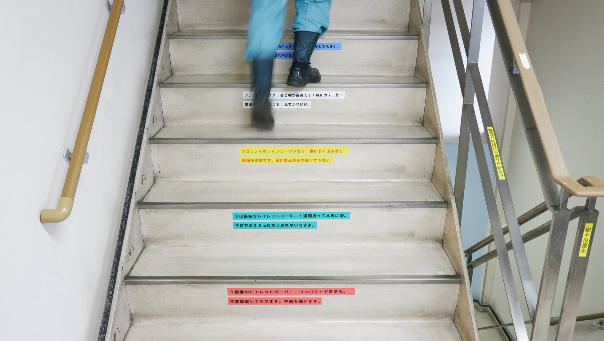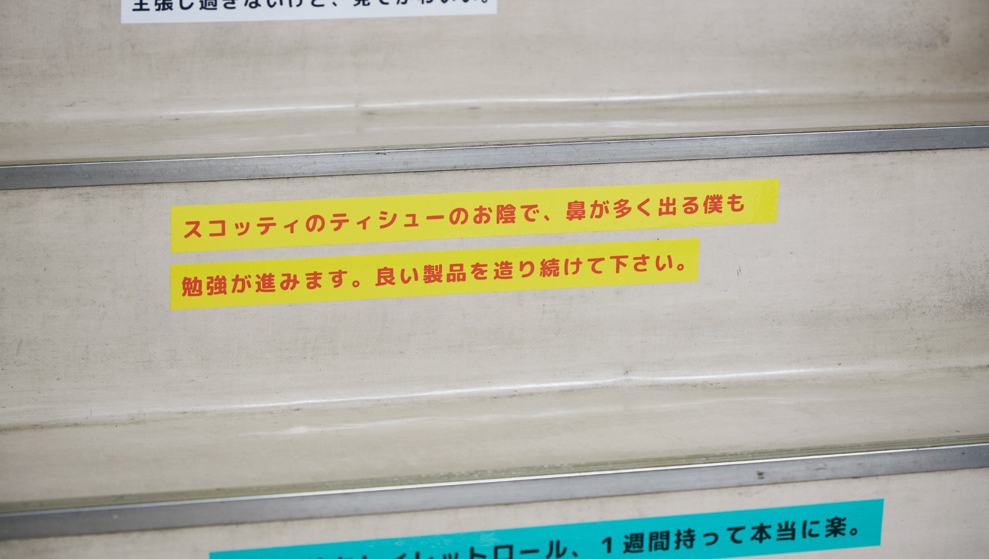 協力いただいた工場は、日本製紙クレシア株式会社。自分たちの仕事で、よろこんでくれる人がいる。そう感じられると、働くモチベーションも上がるもの。そこで、カスタマーセンターに寄せられた、商品に対するお客さまからのお褒めの言葉を、Excelからの流し込み印刷機能でラベル化、工場内の階段に貼り付けしました。読むたびに励まされそうです、との反応をいただきました。