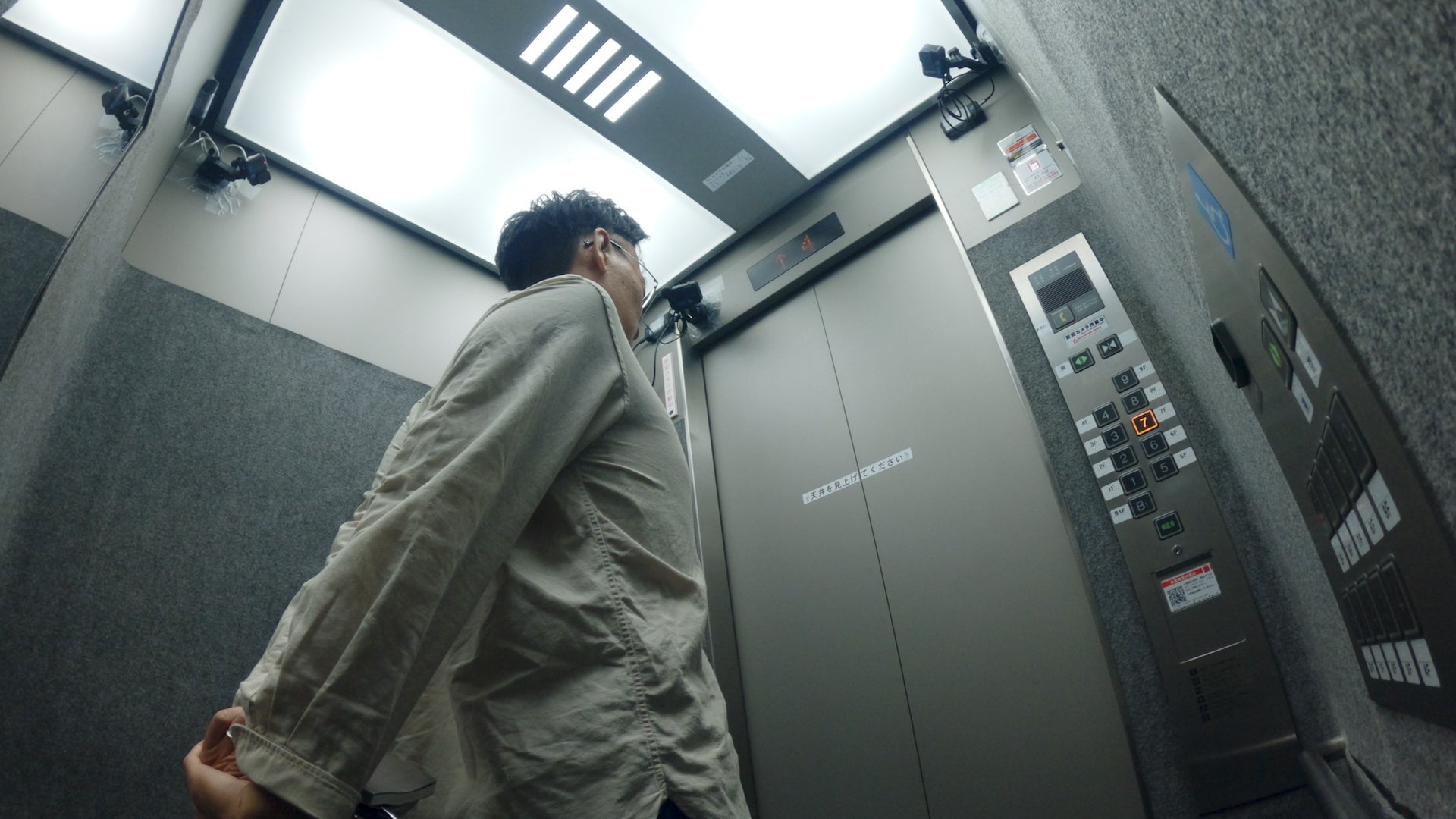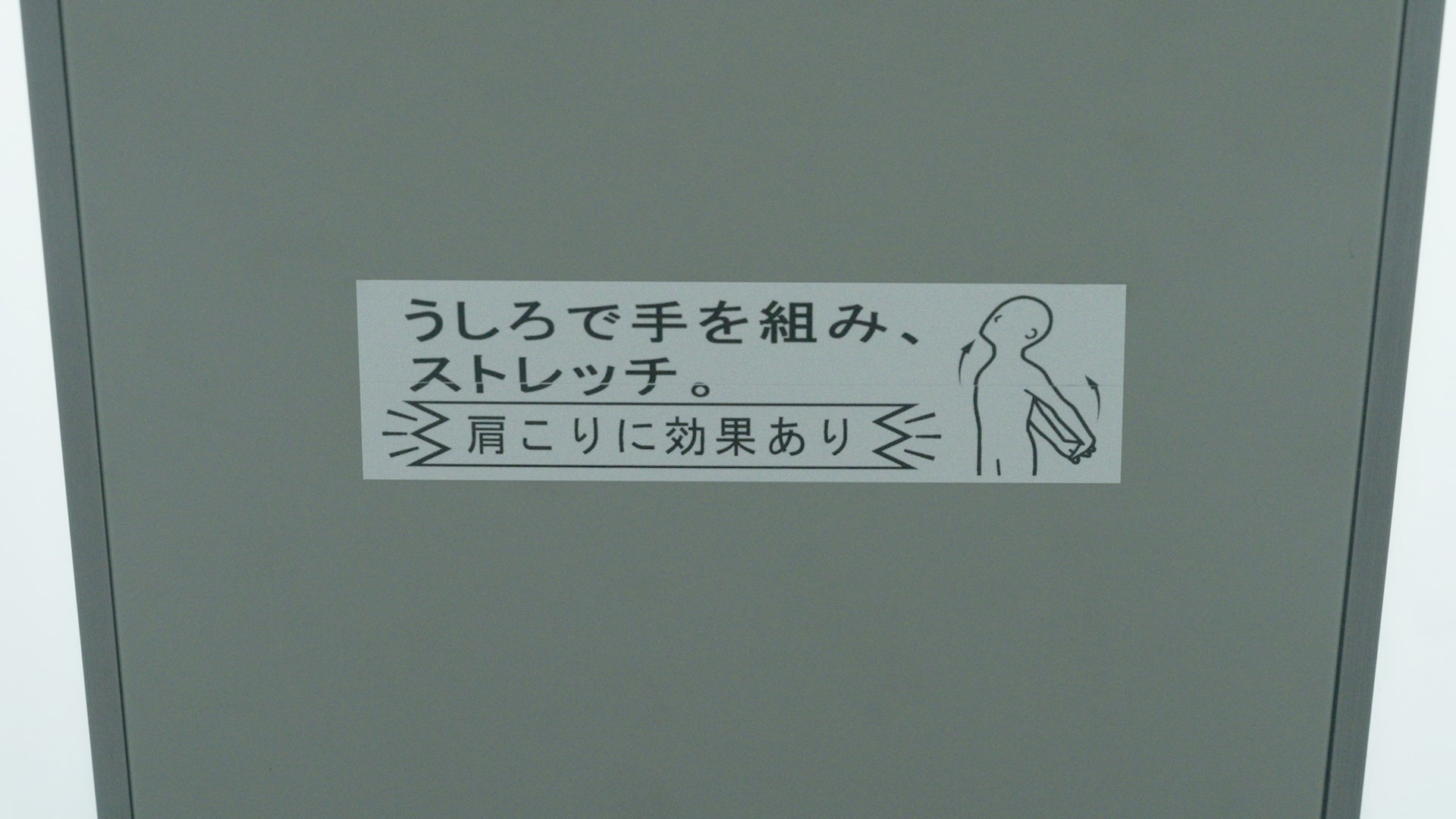 対象となるのは、デスクワークで肩こりがつらそうな社員。そこで、エレベーターでの移動時間を利用してストレッチを促すラベルを。ドアが閉まると、「天井を見上げてください」と書かれたラベル。目線を送った先の天井には「うしろで手を組み、ストレッチ。」というラベルが。その指示の通りにストレッチをした社員は、肩こりが少し楽になった気がした様子で出ていきました。