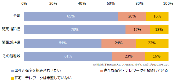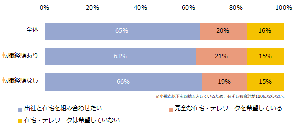地域別で見ると、関東1都3県では「出社と在宅を組み合わせたい」と回答した方が、関西2府4県やその他地域よりも多いことが分かりました(関東1都3県:70%、関西2府4県:54%、その他地域:61%)。転職経験別では大きな差はありませんでした。今後の働き方について、それぞれの回答の具体的な理由もご紹介します。