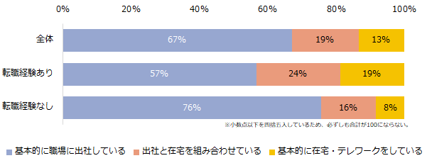 テレワーク実施状況を転職経験別で見ると、「出社と在宅を組み合わせている」方の割合は、転職経験者が転職未経験者の1.5倍に(転職経験あり:24%、転職経験なし:16%)。また「基本的に在宅・テレワークをしている」方の割合は、転職経験者が転職未経験者の2倍以上になりました(転職経験あり:19%、転職経験なし:8%)。