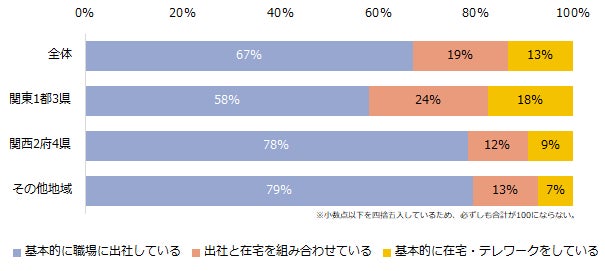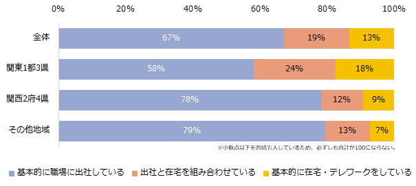 地域別でテレワークの実施状況を伺うと、「基本的に職場に出社している」と回答した方は、関東1都3県が58%と一番少ない結果となりました。関西2府4県は78%、その他地域が79%と、地域によって出社率に差があります。関東1都3県で「出社と在宅を組み合わせている」「基本的に在宅・テレワークをしている」と回答した方は、関西2府4県やその他地域の約2倍に及ぶ結果となりました。