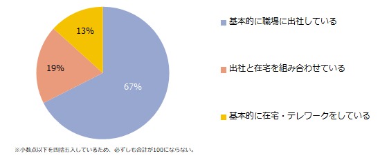 「現在テレワークは実施されていますか?」と伺うと、67%の方が「基本的に職場に出社している」と回答しました。「出社と在宅を組み合わせている」と回答した方は19%、「基本的に在宅・テレワークをしている」と回答した方は13%でした。