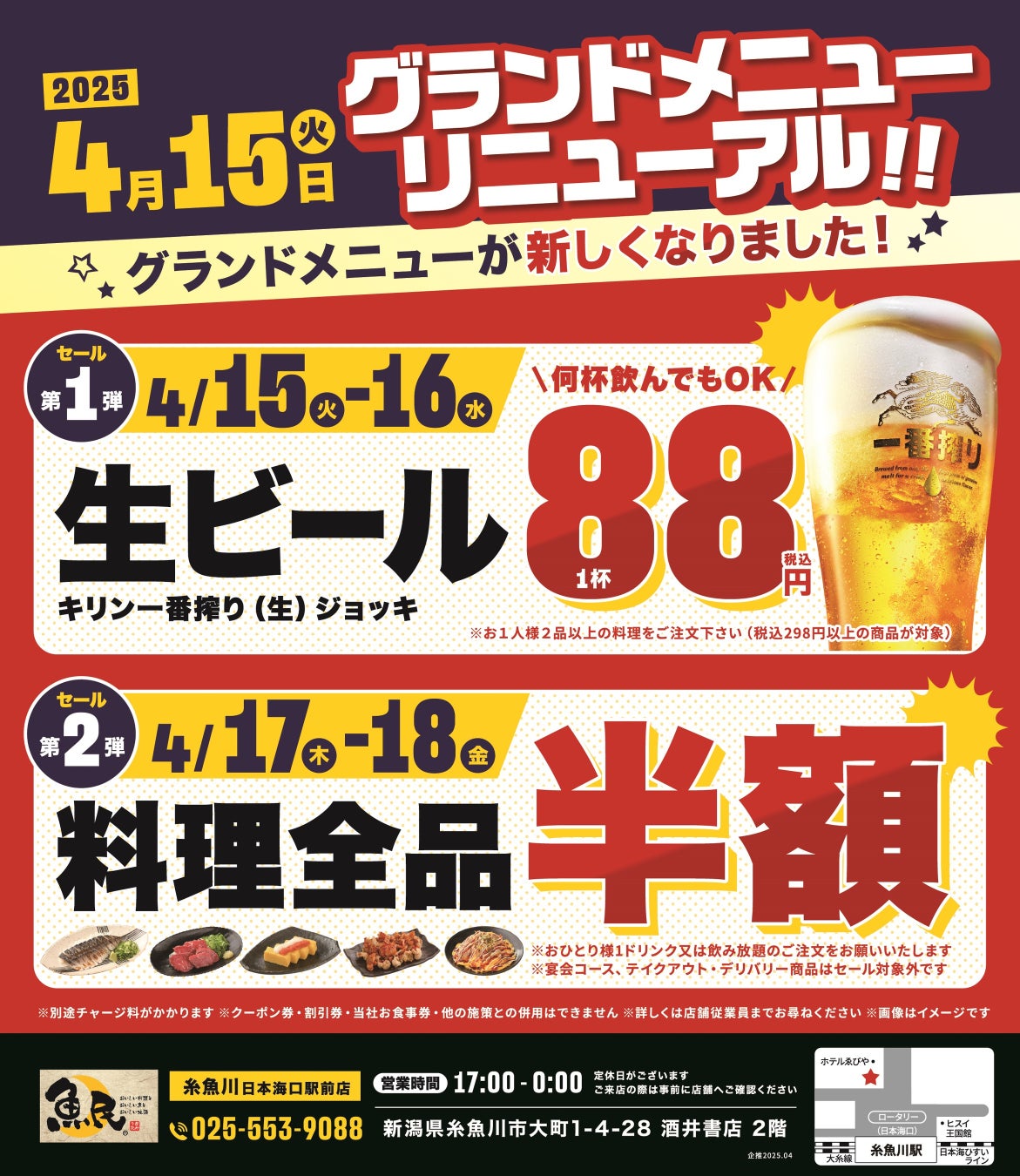 「魚民 糸魚川日本海口駅前店」では、グランドメニューリニューアルを記念したセールを開催いたします!