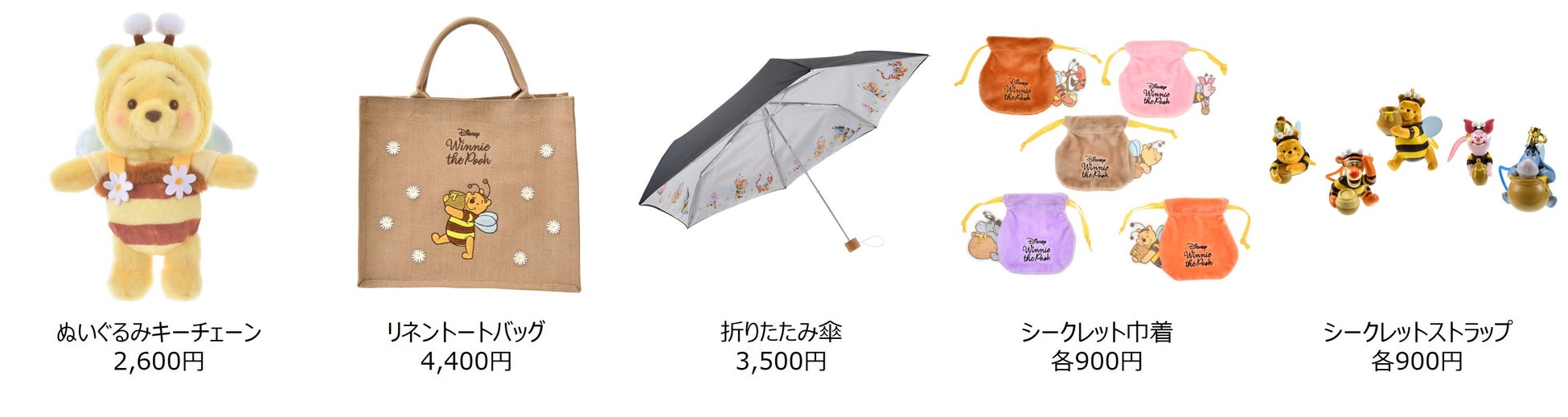 ラインナップは、サスペンダーやおしりについたお花とふわふわの羽がチャーミングなぬいぐるみとぬいぐるみキーチェーンをはじめ、リネントートバッグやミニタオル、折りたたみ傘といったおでかけのお供にぴったりなアイテムを展開。また、レジャーシートやバスケット、コップセットなど夏のビーチや公園でピクニックを満喫したくなるような、心ときめくアイテムも揃えました。さらに、大人気のシークレットアイテムからハニーポットをモチーフにしたミニサイズの巾着とミツバチ姿のプーさんたちのストラップもご用意しました。思わず集めたくなるキュートなアイテムです。
