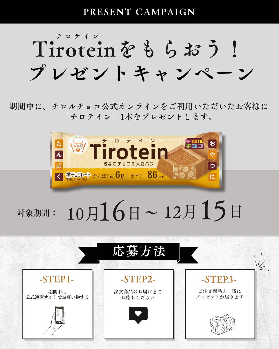 対象期間中(10/16~12/15)にご利用のお客様全員にチロテインを1本プレゼント!