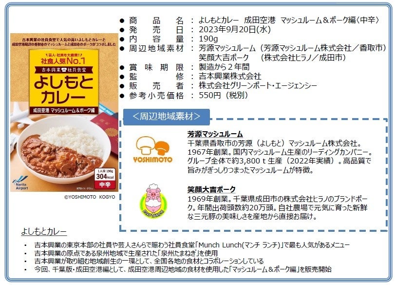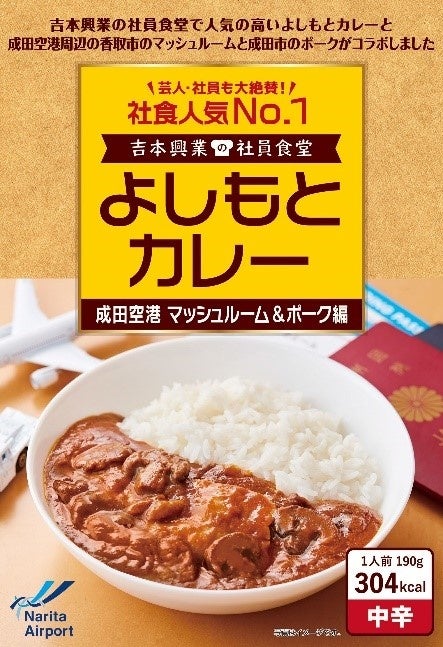 その取り組みの一環として、株式会社グリーンポート・エージェンシーと成田国際空港株式会社は、吉本興業株式会社とコラボレーションし、空港周辺地域の美味しい食材(マッシュルーム/豚バラ肉)を贅沢に入れ込んだレトルトカレー「よしもとカレー 成田空港 マッシュルーム&ポーク編」を共同開発しました。