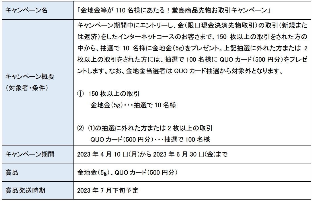 本キャンペーンでは、商品先物取引の金(限日現金決済先物取引)について、150枚以上の新規または返済の取引をされたお客さまの中から、抽選で10名様に金地金(5g)をプレゼントします。また金地金の抽選に外れた方または2枚以上の取引をされた方の中から、抽選で100名様にQUOカード(500円分)をプレゼントします。