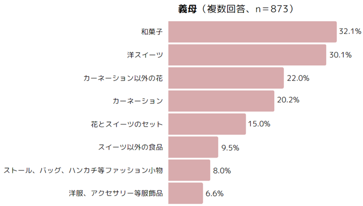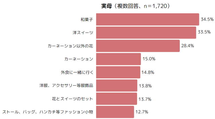 ・贈る予定のものは、実母・義母ともに、1位「和菓子」、2位「洋スイーツ」、3位「カーネーション以外の花」。(複数回答)