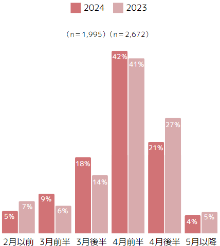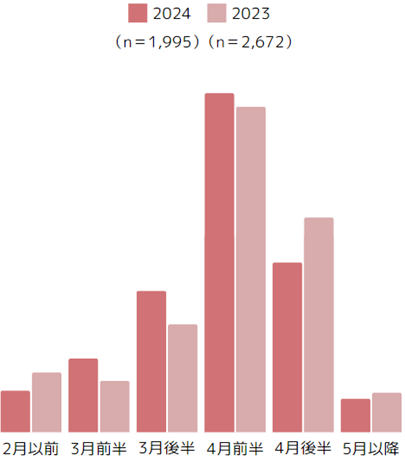 ・母の日ギフトの検討を始める時期としては、 「4月前半」が最も多い回答に。昨年に比べ、「4月後半」に検討する人が6ポイント減少し、前倒し傾向。