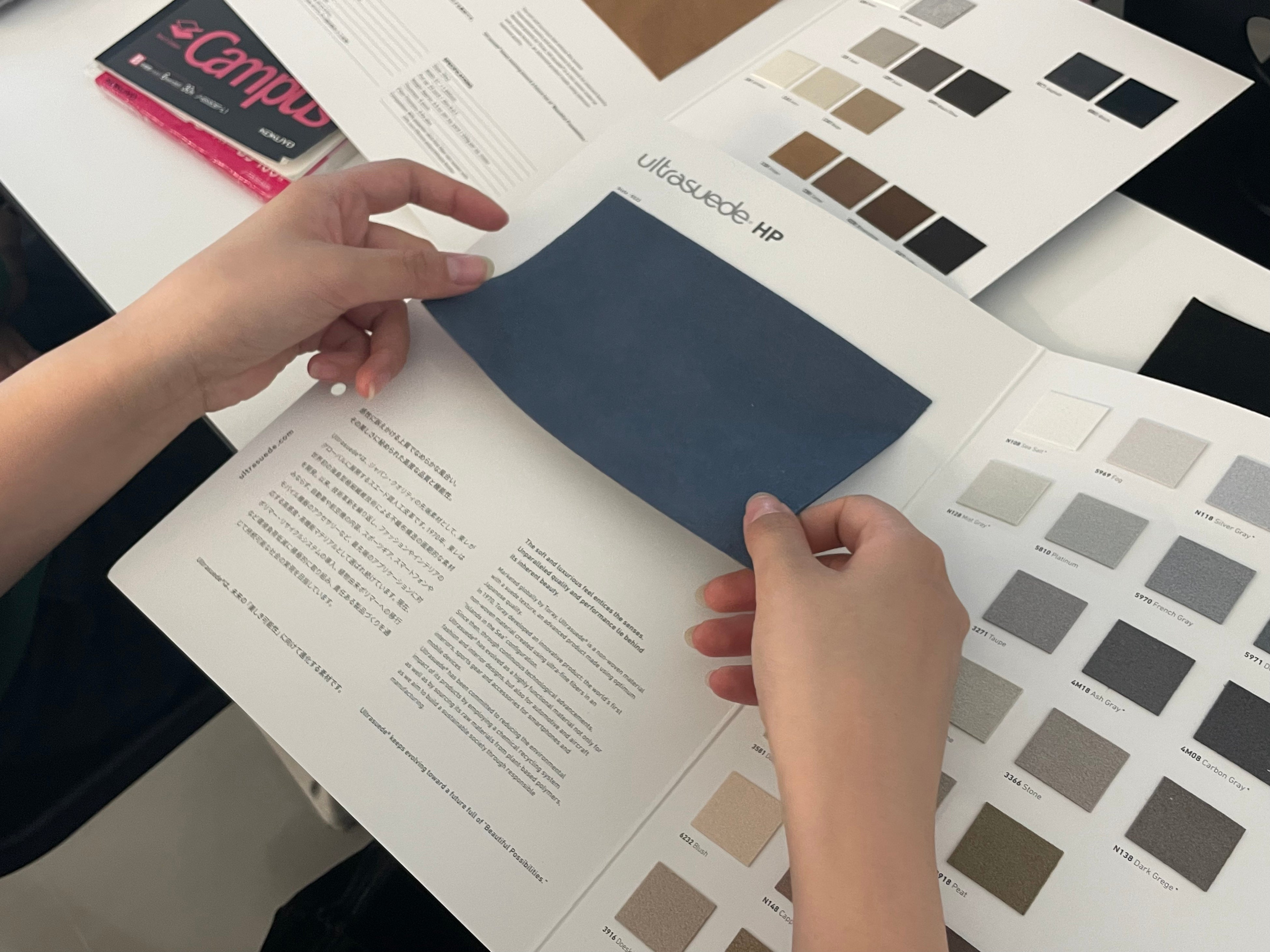 教室には「ウルトラスエード®」が使われたファッションアイテムが並べられ、学生たちは素材がどのようにデザインに取り入れられているかを実際に目にしました。学生にとってハイブランドは触れる機会が少ないものです。アイテムを着用したり、裏側の隅々まで観察したりと、大変貴重な経験となったようです。