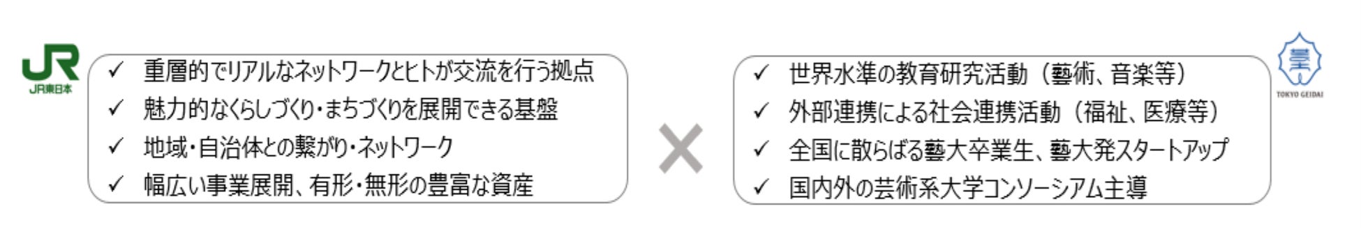 東京藝術大学は藝術・音楽などの分野における世界水準の教育研究活動を行っており、福祉や医療など藝術以外の分野においても社会連携活動を行うなどしております。また、JR東日本には「駅」「鉄道網」といったアセットがあり、多種多様なサービスの提供を行うノウハウを有しています。両者の強みを最大限掛け合わせて協業を図ることで、社会のさまざまな課題の解決に向けた取り組みを推進し、「心豊かな生活」の実現を目指します。