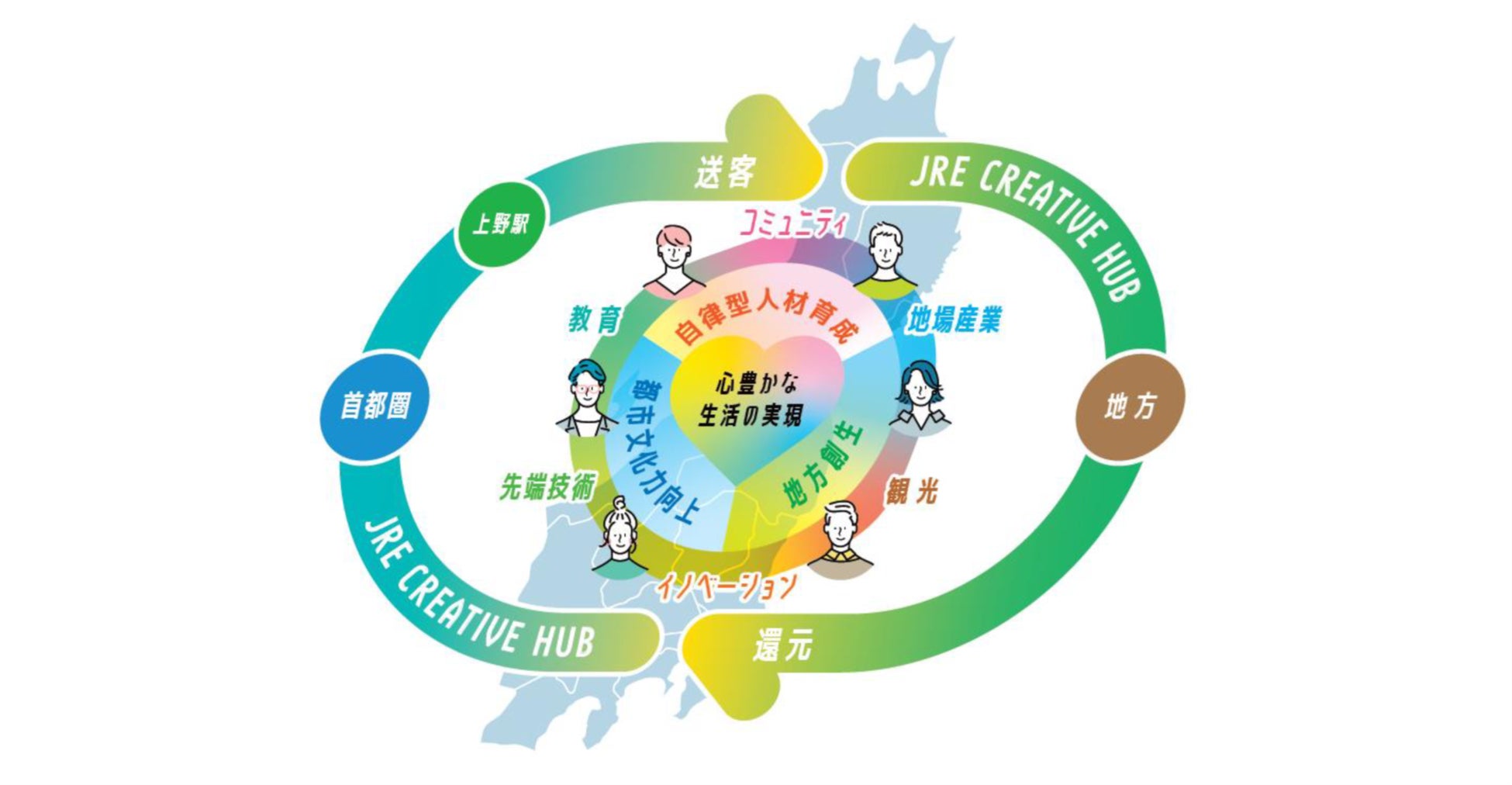 首都圏および地方に協業拠点「JRE CREATIVE HUB」を構築し、拠点においてさまざまな取り組みを行うことで以下内容を実現し、心豊かな生活への貢献を図ります。